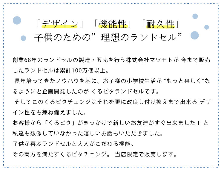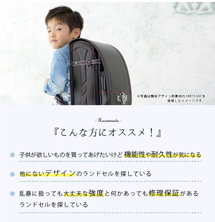 仕様紹介 品番:1KR9550CM(迷彩) カラー:ブラック・ブルーステッチ(1070)/ブラック・ゴールドステッチ(1090) 素材:かぶせ:スーパータフガード(人工皮革) 背裏:エアリー(人工皮革) 重量:約1,280g サイズ:内寸:縦31×横23.5×マチ12(cm)※A4フラットファイルサイズ 背カン:ウイング背カン 補強:ダブルストロング製法 その他機能:ワイドポケット/くるピタチェンジ(付け換え錠前1個付属)/反射材(かぶせ、マチベルト、肩ベルト)/安全ナスカン/持ち手付き ※本商品は名入れサービス対象外です。
